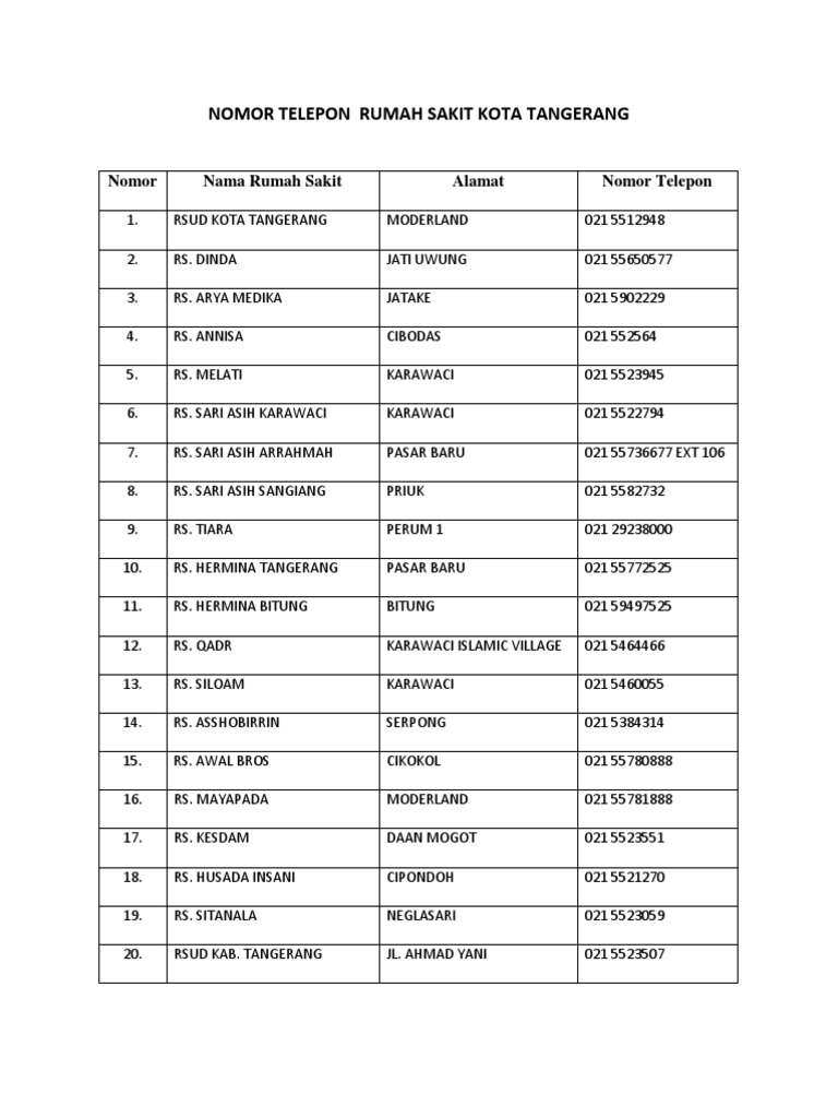 Inilah rekomendasi tentang No Telp Rumah Sakit Annisa Tangerang. RS Annisa Tangerang berlokasi di Jalan Gatot Subroto No. Nama Rumah Sakit Alamat No Telepon No Fax Up Ri.