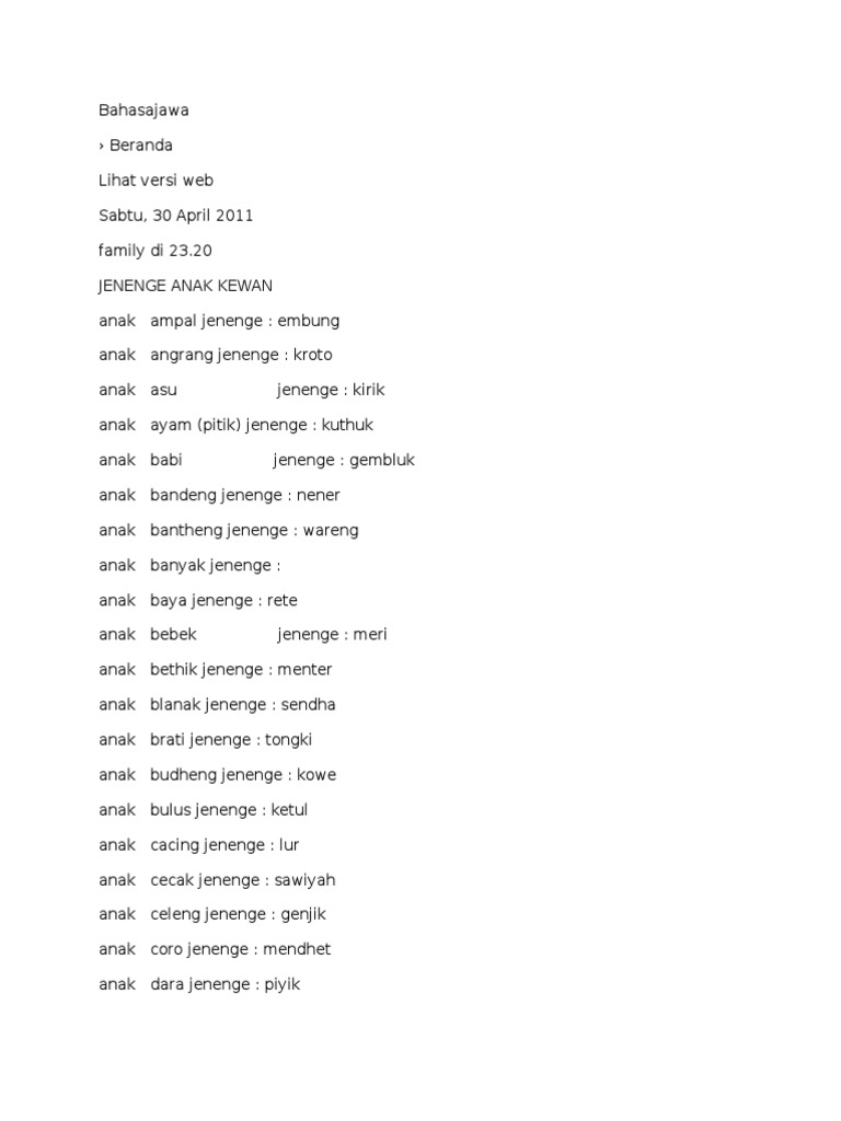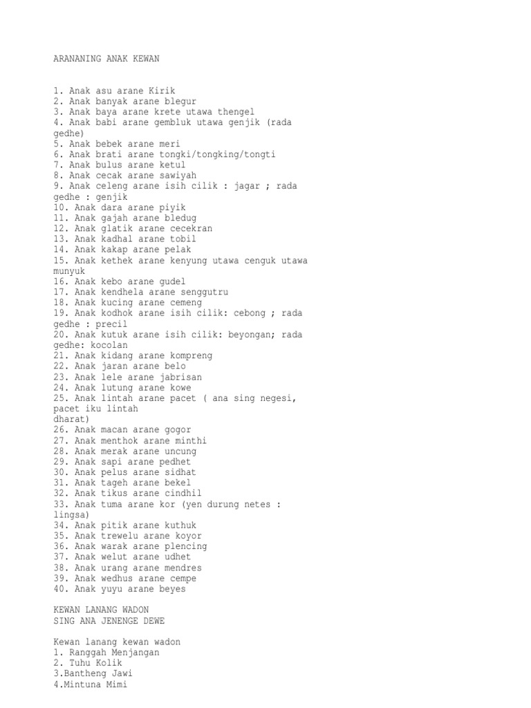 Jenenge anak kewan Salah satu materi yang pasti muncul dalam pembelajaran Bahasa Jawa adalah Bab tentang jenenge anak kewan atau arane anak kewan. Da semoga bermanfaat degan nama turunane anak hewan dalam bahasa jawa diatas yang kami lumpulkan bersal dari pelajaran pepak basa jawa. 22 September 2020 1628 Unknown mengatakan.